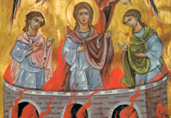 Deci, fiind ei aruncaţi, a ieşit focul din cuptor şi a ars pe cei ce-i clevetiseră pe dânşii. Iar cei trei bărbaţi drepţi, au căzut ferecaţi în mijlocul cuptorului ce ardea cu foc mare şi umblau prin mijlocul văpăii, lăudând pe Dumnezeu şi binecuvântându-L. Dar n-au încetat cei ce i-au aruncat pe ei în foc, adică slugile împăratului a arde în cuptorul cu iarbă, pucioasă, smoală, câlţi şi viţe. Şi s-a ridicat para cuptorului ca la patruzeci de coţi, încât a înconjurat şi a ars pe toţi cei ce erau împrejurul cuptorului haldeilor. Iar îngerul Domnului s-a pogorât spre cei ce erau cu Azaria în cuptor şi a spulberat para focului din, suflând, ca un duh de rouă, încât nu s-a atins de dânşii focul nicidecum, nici nu i-a mâhnit şi nici nu i-a supărat pe ei.