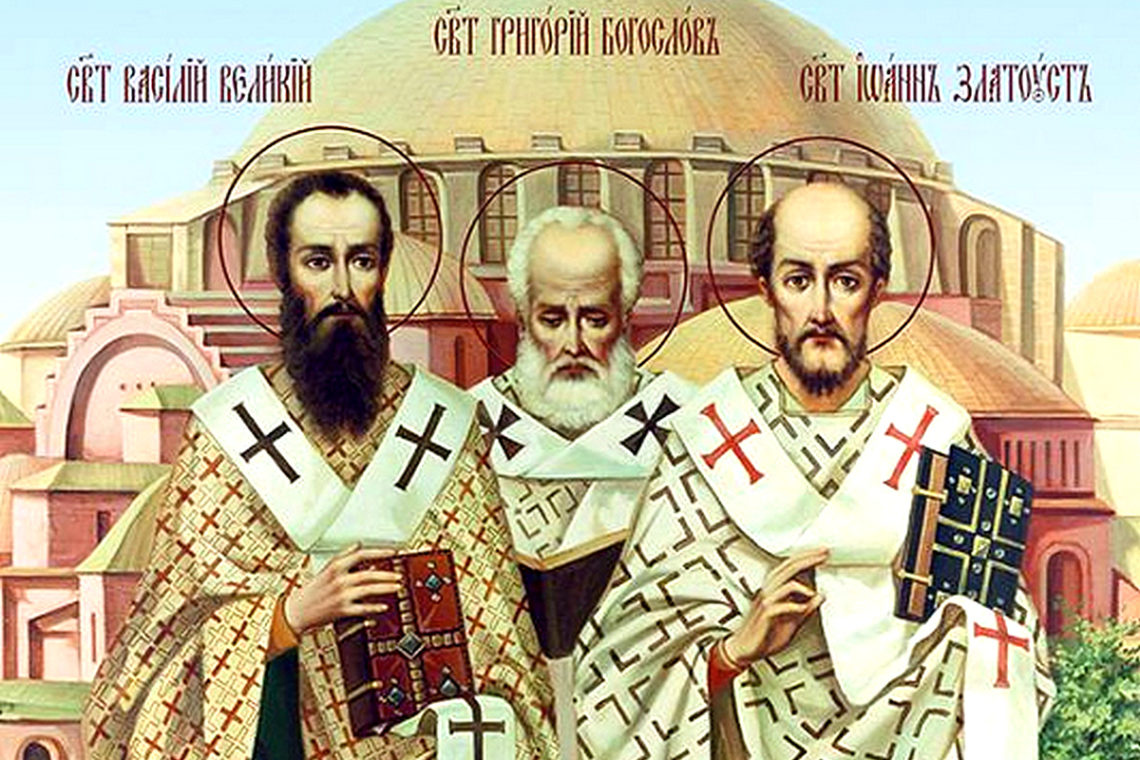 Pe acești trei mari ierarhi ai Bisericii lui Dumnezeu Cel slăvit în Sfânta Treime se cuvine să-i cinstim ca pe unii ce au primit de la Dumnezeu mari daruri și aleși talanți: pe Vasile, cel ce a rușinat păgânătatea împăratului Iulian apostatul, cel ce a mustrat pe împăratul Valent arianul, cel ce a înfricoșat pe eparhul ce nedreptățise la judecată pe o văduvă săracă, și a botezat pe evreul Ioasaf cu toată casa lui; pe Grigorie, mare ritor și vrednic patriarh al Bisericii Constantinopolului, cel ce a întrecut cu înțelepciunea pe toți cei mai învățați din timpul acela; și pe Ioan Gură de Aur, cel ce cu învățăturile sale a covârșit pe cei mai luminați și mai aleși grăitori ai lumii. Se cuvine să-i lăudăm și să zicem lui Dumnezeu: Aliluia!