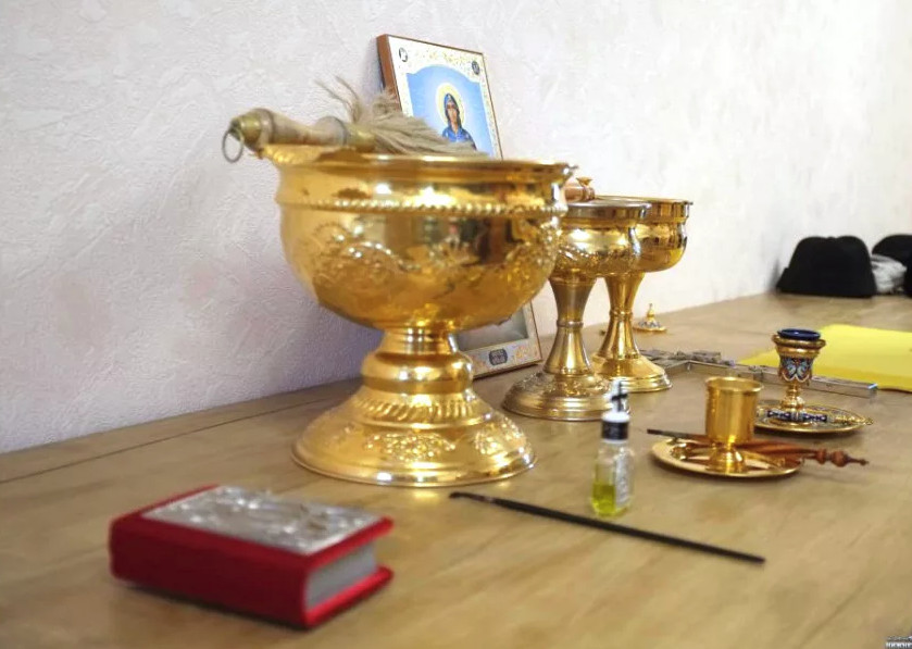 - Un vas pentru aprinderea de tămâie (se găseşte în comerţ aşa-numitul căţui). De regulă, preotul aduce cu el cărbuni, tămâie şi căţui, dar este recomandat să discutaţi acest amânunt înainte.