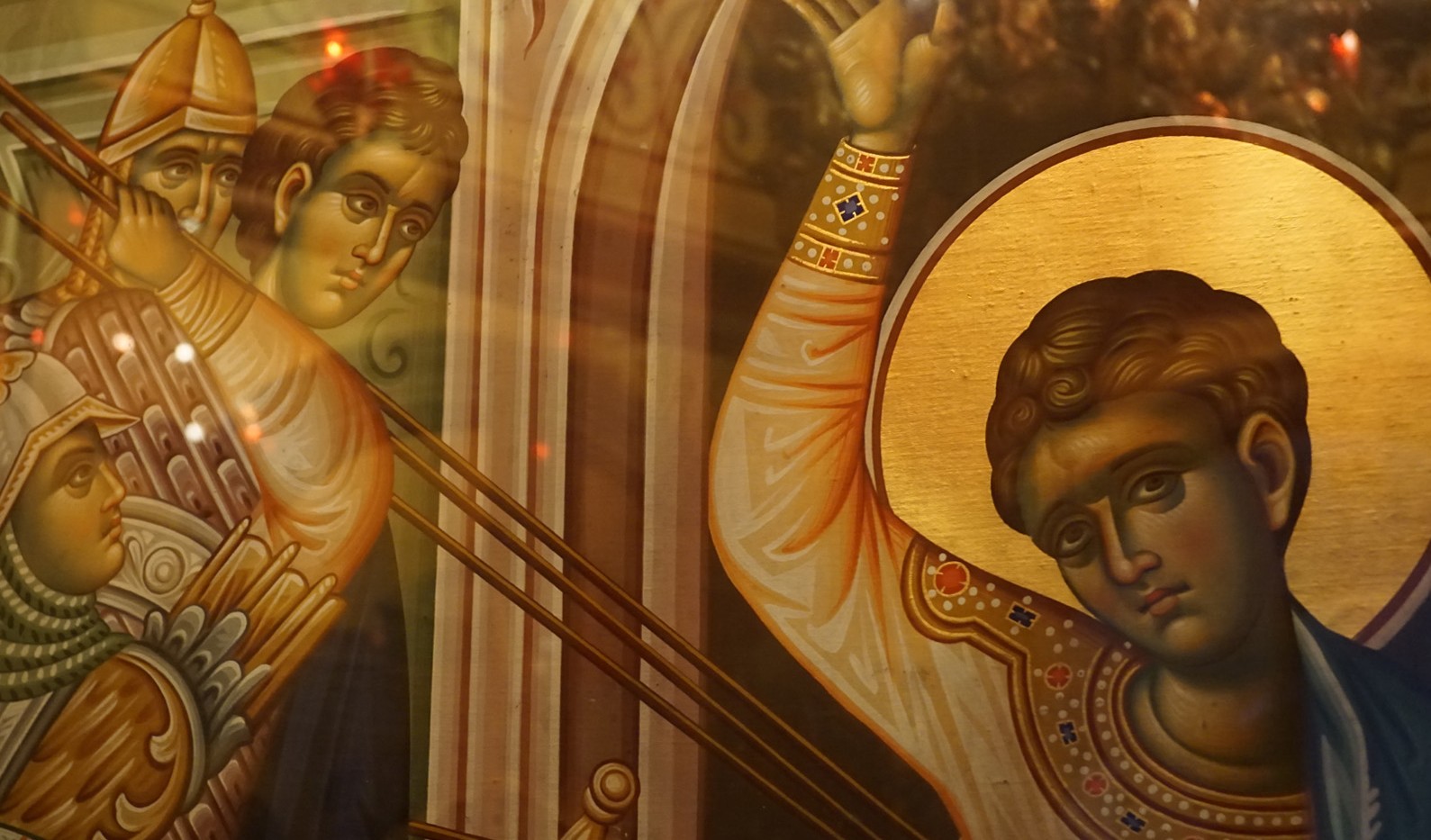 Bucură-te mucenice Dimitrie, că ai fost cu adevărat imitator al lui Hristos[25]. Căci Acela pentru noi toți a fost însulițat de oșteni nelegiuiți în coasta[26] cea fără de prihană, iar tu ca un oștean dreptcredincios al Lui pentru dragostea Lui ai fost însulițat în temniță de bărbați fărădelege.