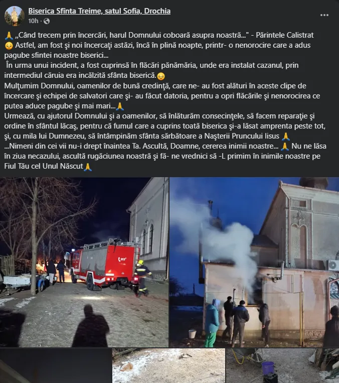 „Urmează, cu ajutorul Domnului și al oamenilor, să înlăturăm consecințele, să facem reparație și ordine în sfântul lăcaș, pentru că fumul care a cuprins toată biserica și-a lăsat amprenta peste tot”, se arată într-o postare publicată de parohia „Sfânta Treime”.