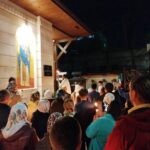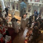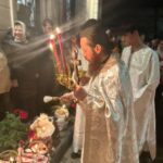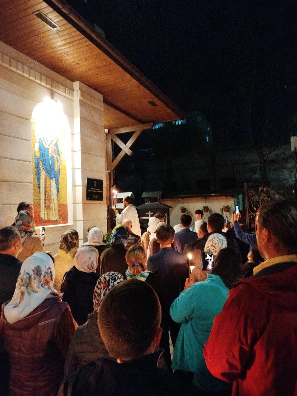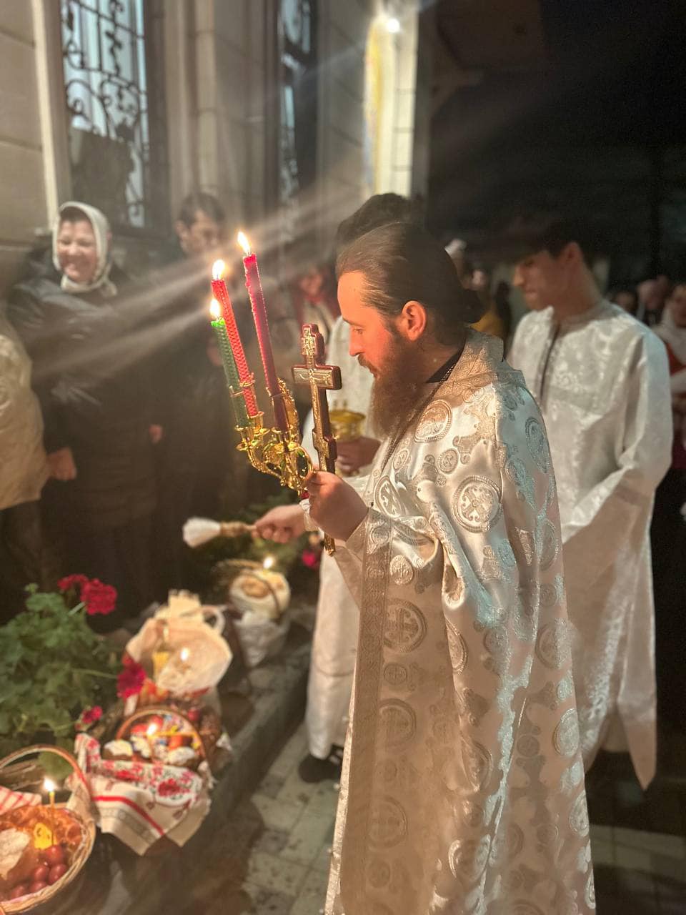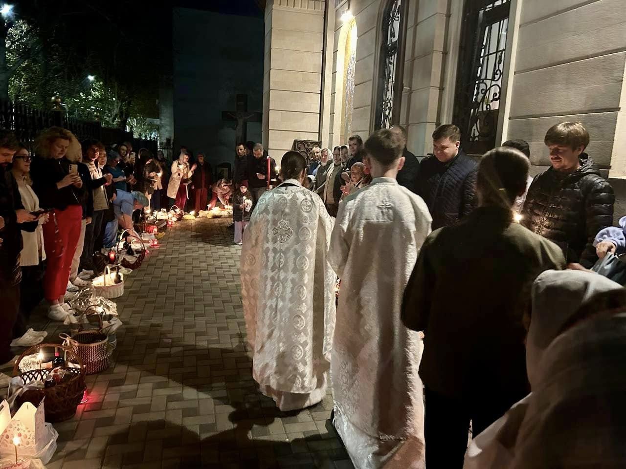 În dangătul clopotelor, preotul, împreună cu membrii corului, au ieșit în curtea bisericii, unde au intonat din nou imnul biruinței asupra morții, binecuvântând cu apă sfințită coșurile cu păscuțe și alte bunătăți pregătite cu dragoste pentru această mare sărbătoare.