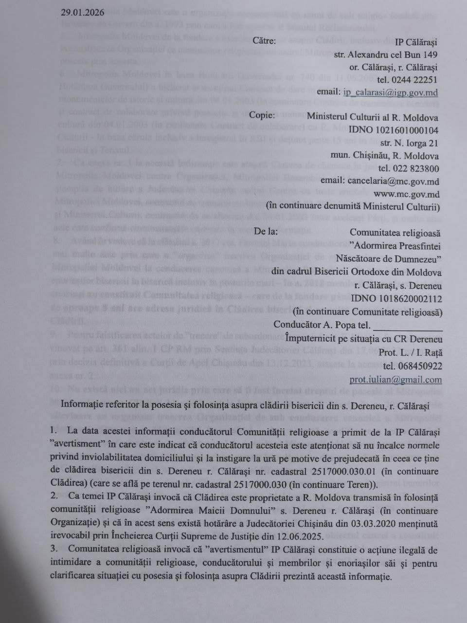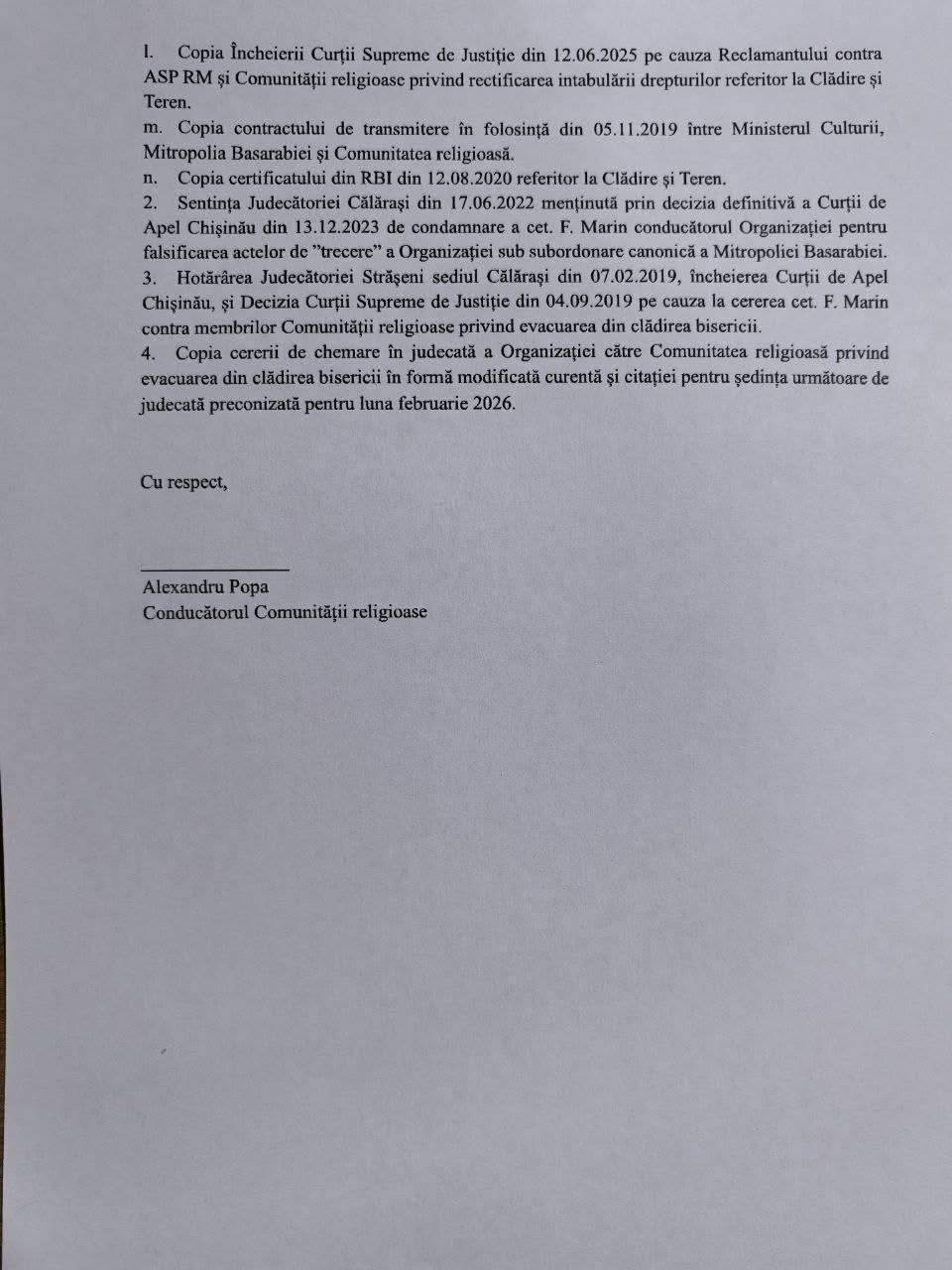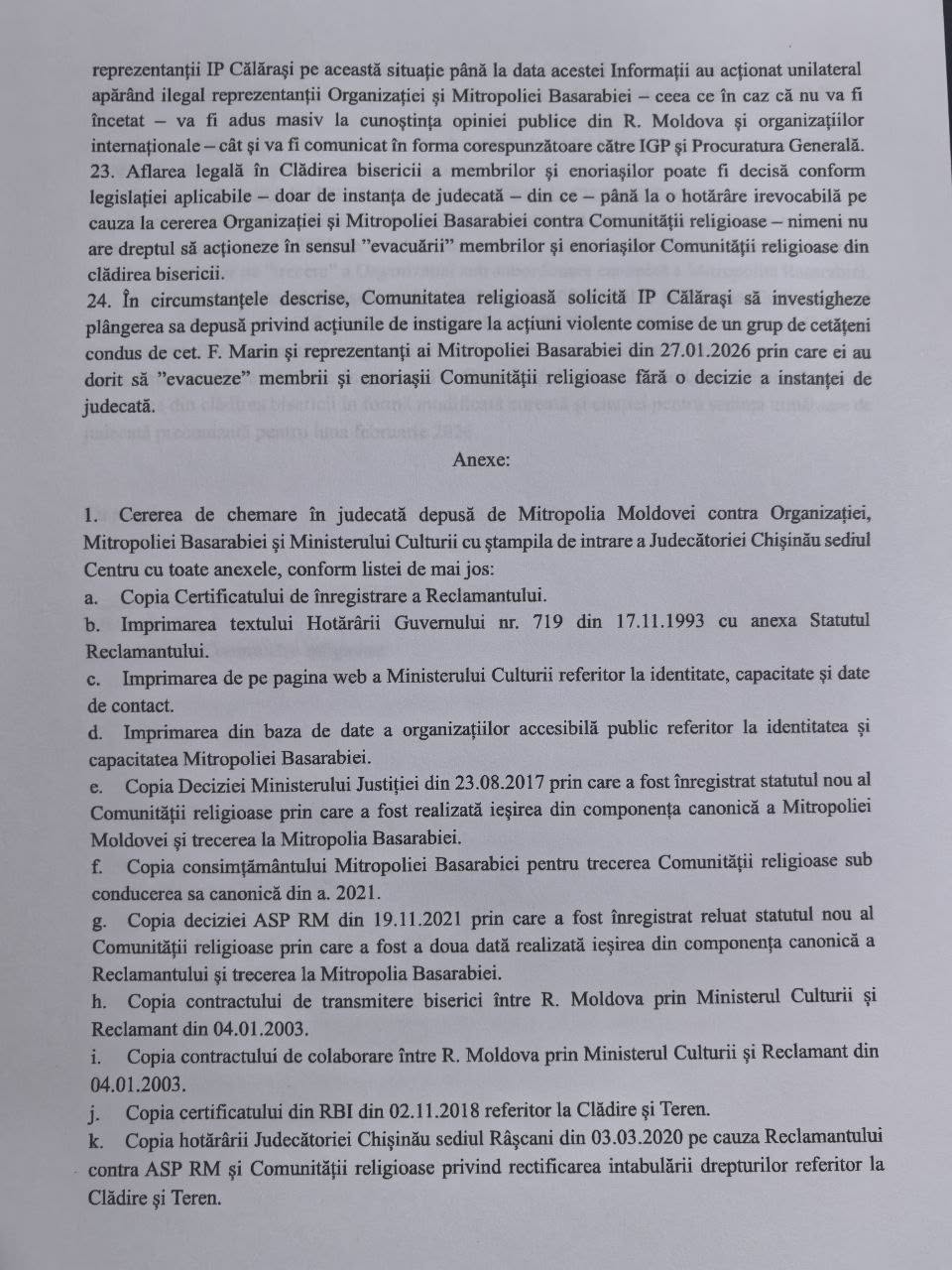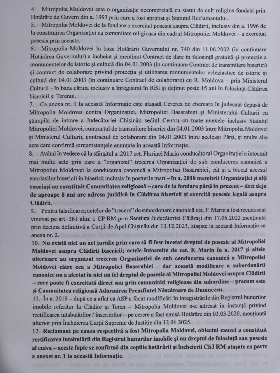 Pe scurt, confirmăm: Nu există nici un act juridic prin care să fi fost încetat dreptul de posesie al Mitropoliei Moldovei asupra Clădirii bisericii. Actele întocmite de cet. F. Marin în a. 2017 și altele ulterioare au organizat trecerea Organizației de sub conducerea canonică a Mitropoliei Moldovei către cea a Mitropoliei Basarabiei – dar această modificare a subordonării canonice nu a afectat în nici un fel dreptul de posesie al Mitropoliei Moldovei asupra Clădirii – care poate fi exercitată direct sau prin comunități religioase din subordine – precum este și Comunitatea religioasă Adormirea Preasfintei Născătoare de Dumnezeu. 2. Astfel, la data acestei informații – situația juridică este următoare: Biserica Ortodoxă din Moldova, Mitropolia Moldovei din a. 1993 deține posesie asupra Clădirii bisericii. Alte aspecte juridice pot fi analizate din adresarea ce este anexată.