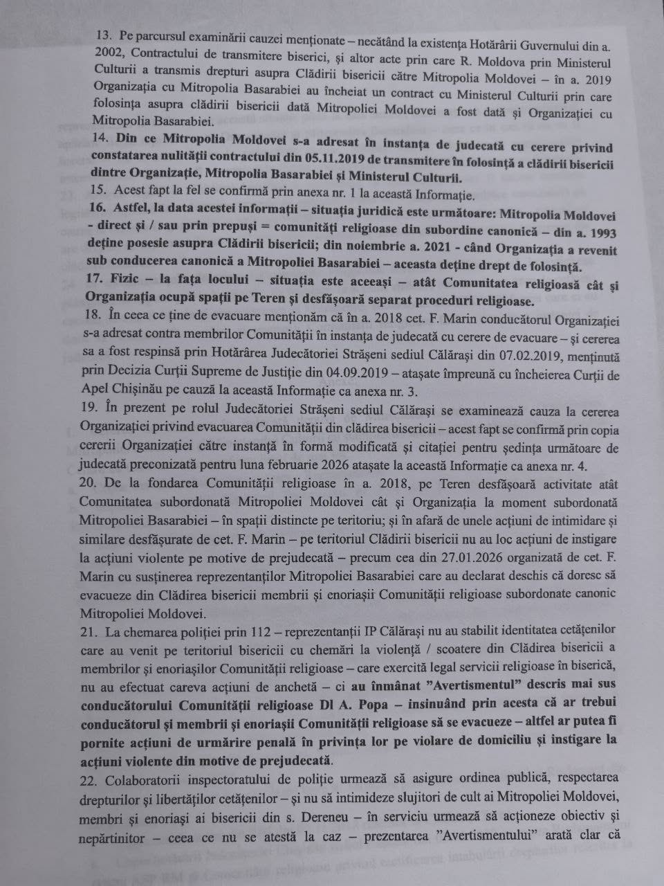 Din materialele video apărute în spațiul public din ziua de 27 ianuarie 2026, concluzionăm și regretăm faptul că colaboratorii de poliție vădit, fără temei juridic, discriminează enoriașii din satul Dereneu ai Bisericii Ortodoxe din Moldova în favoarea câtorva preoți adepți ai Mitropoliei Basarabiei, veniți în această localitate din alte sate și raioane.