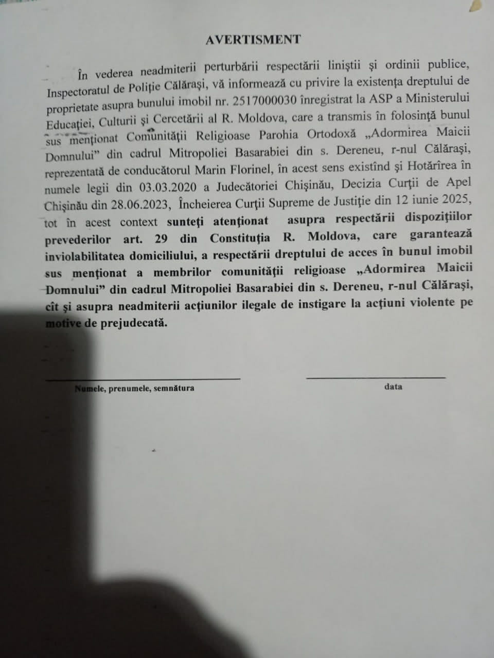 Notă informativă vizavi de situația de la Biserica Ortodoxă din s. Dereneu, rn. Călărași