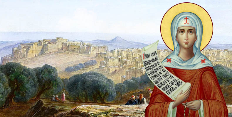 Cuvioasa văzând mai înainte ducerea ei către Dumnezeu a înconjurat toate sfintele locuri din Ierusalim şi cele dimprejur, din Betleem şi Galilea. Apoi, sosind praznicul Naşterii Domnului nostru Iisus Hristos, a fost la privegherea de toată noaptea, în peşteră unde s-a născut Domnul; şi acolo i-a spus unei surori care îi era rudenie şi petrecea lingă dânsa, fiind nedespărţite, că acum săvârşeşte praznicul cel mai de pe urmă al Naşterii Domnului; şi a plâns rudenia ei foarte mult. Apoi în ziua Sfântului mucenic Ştefan a fost în biserica lui la cântărea de toată noaptea. În acea zi, citind surorilor pătimirea sfântului mucenic, a adus şi către dânsele acestea, zicând că acum le-a făcut citirea cea din urmă; deci s-a făcut plângere mare între surori pentru dânsa, căci au priceput că acum are să se ducă dintre ele. Iar ea cu cuvinte de Dumnezeu insuflate, precum îi era obiceiul, le mângâia mult, învăţându-le din belşug spre fapta bună.